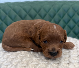 He is charting to be 12-16 pounds. He will have a wavy coat with little to no shedding. He is a beautiful deep red. Rivers is very playful and loves balls and toys. He likes human interaction and is very curious. He is food driven which in turn will make him easier to train. He was born on 12-26-25 and will go home February 20th.